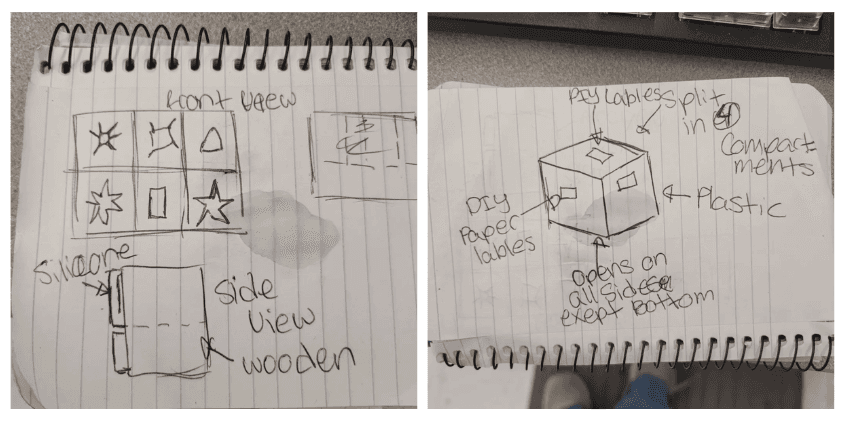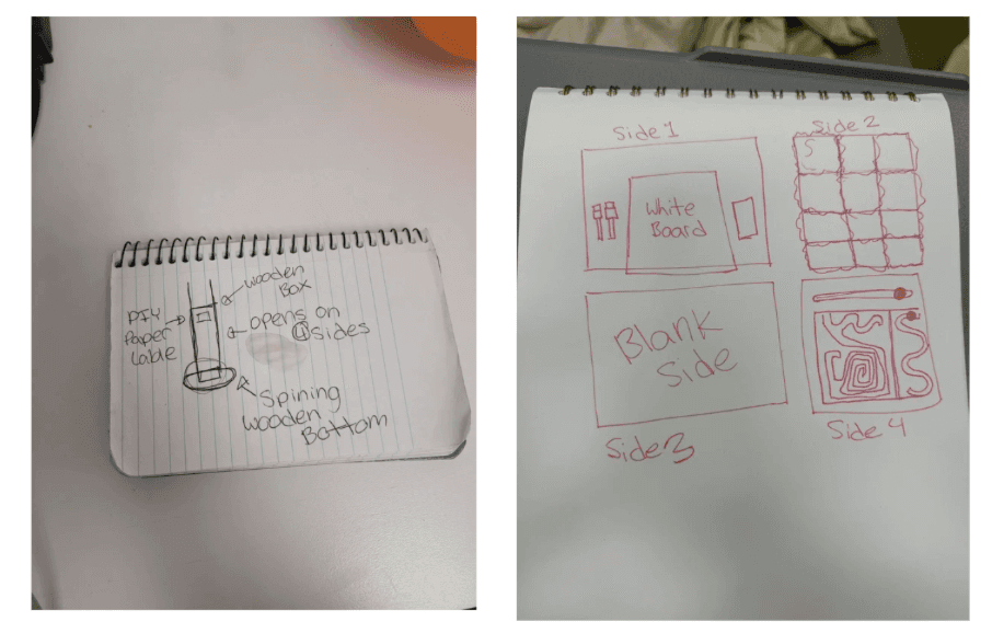 When rediscovering the purpose of a box, our group was wondering how we would hack its shape, size, and configuration, while ensuring that its purpose was practical and useful. The idea of children’s toys then came to our heads. Children’s toys tend to get very messy, inconveniencing parents with cleanup duties in different organizational bins and teaching discipline. Would this be improved with the introduction of an interactive storage box that can both hide and carry toys for children, serve as a seat, and as an activity that children can participate in? The idea is for children to be able to play with the different sides of the “box”, being able to interact with the different toys on each side, with pieces that can be used for the sides able to be stored inside of the “box” as well. Another feature is to store other general toys that will be easy for parents to encourage clean up duties for their children. They will also be able to use the “box” as a chair when it is not being played with, so that there are multiple uses for the “box” without it being an inconvenience
